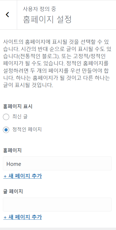 2) 홈페이지 설정에서 홈페이지 표시를 정적인 페이지로 설정하고 홈페이지를 Home으로 설정합니다.