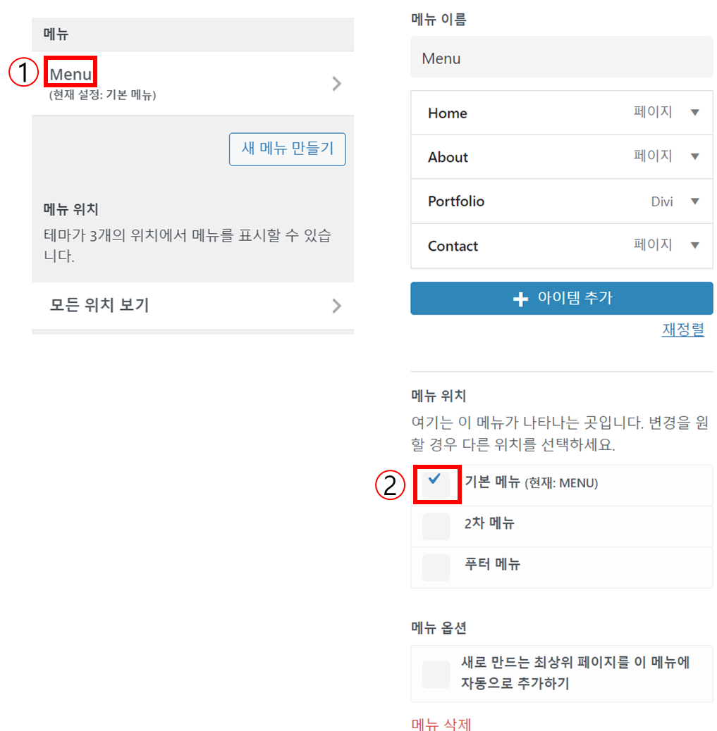 4) 메뉴에서 만들었던 Menu를 눌러 들어간 후 메뉴 위치 기본메뉴를 선택합니다.