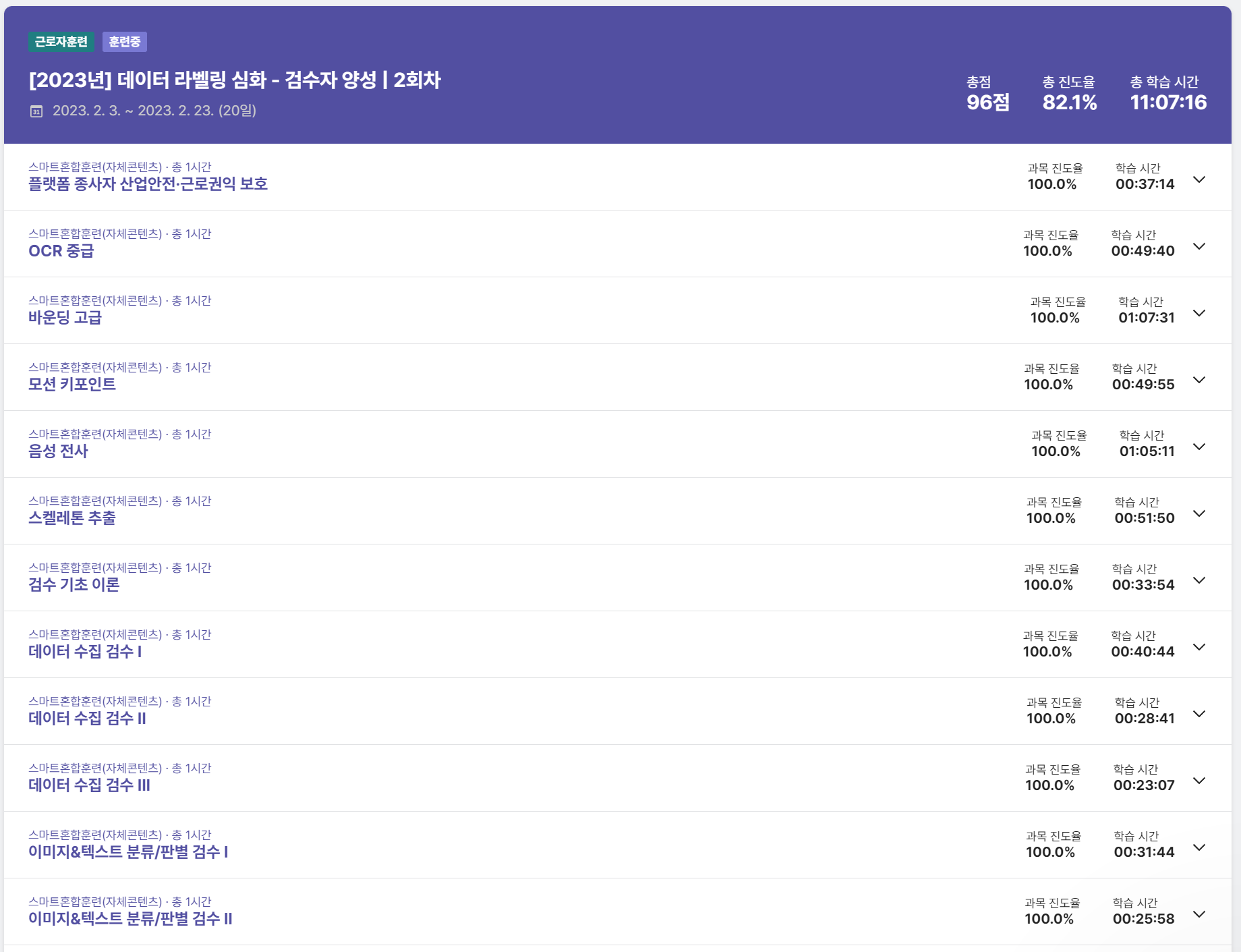 데이터 라벨링에 대한 100% 국비 지원 교육을 들으면서 온라인으로 수강할 수 있는 교육을 들을 수 있게 되어 후기를 남깁니다. 데이터 라벨링에 관한 사이트 중에서는 큰 규모를 가지고 있는 크라우드웍스를 통해 교육을 진행했습니다. 저는 여유 시간이 있어 기초 과정과 심화 과정을 모두 이수했습니다.