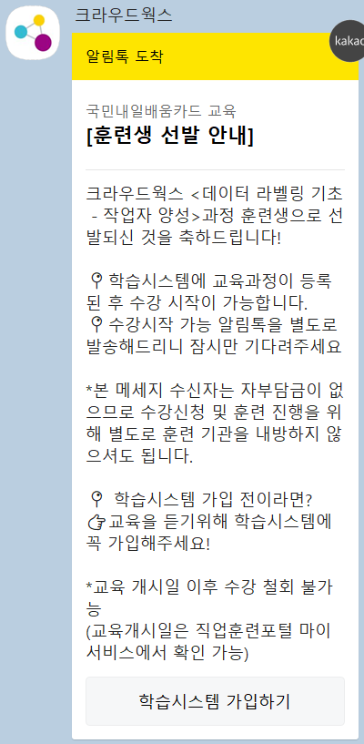 과정에 합격을 하면 아래와 같은 카카오톡 메시지가 와서 훈련생 선발을 알려줍니다.