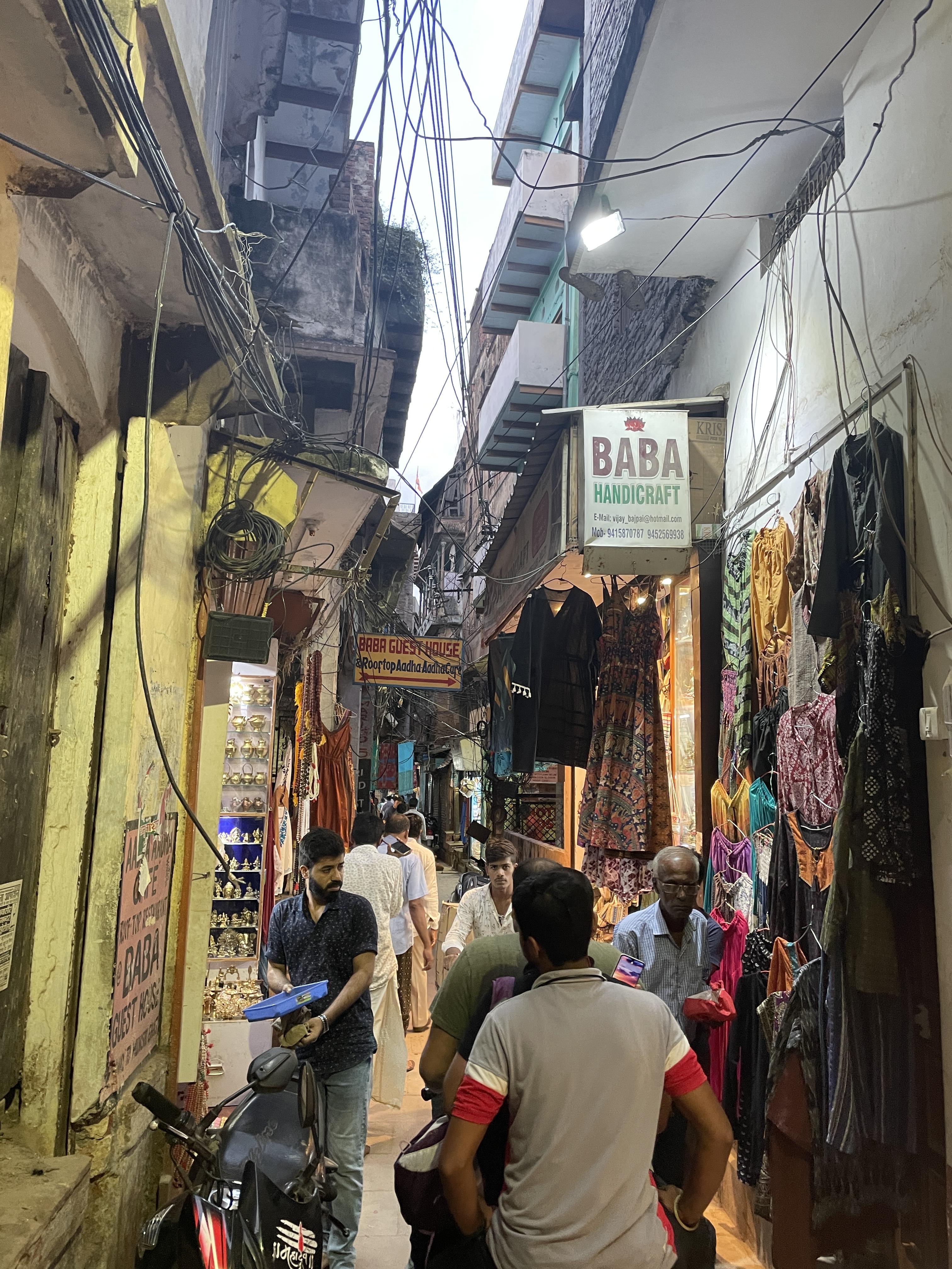 3시 30분 정도에 바라나시 공항으로 도착했다. 바라나시 공항에서 바라나시 중심까지는 거리가 있었기에 택시를 타기로 했다. 우버로 가격을 확인하고 택시기사와 흥정을 했다. 예전에는 여행 다닐 때 흥정하는 게 어려웠는데 이제는 어플이 발달해서 기본가격에서 흥정을 할 수 있어서 여행이 편해졌다. 기사는 1500루피를 불렀는데 700루피로 흥정을 해서 숙소 근처로 향했다. 타고 가는 도중 운전자가 바뀌어서 당황을 했지만 처음 흥정했던 기사는 영어를 잘하는 사장이었다. 운전기사는 영어를 못하는 사람이었다. 소통은 못했지만 바라나시 숙소 근처에 도착했다. 바라나시 강가 근처는 차량을 통제해서 차를 타고 갈 수 없기에 호스텔에서 보내준 사람을 따라갔다. 중간에 실크 가게에 들러서 설명을 들었다. 당황스러웠으나 구입을 하지는 않았다. 실크 가게에 들렀다가 도착했으면서 팁까지 달라고 했다. 어이가 없긴 했으나 100루피를 줬다. 처음 도착한 바라나시의 골목은 좁은 골목에 많은 사람과 동물로 혼란스러웠다.