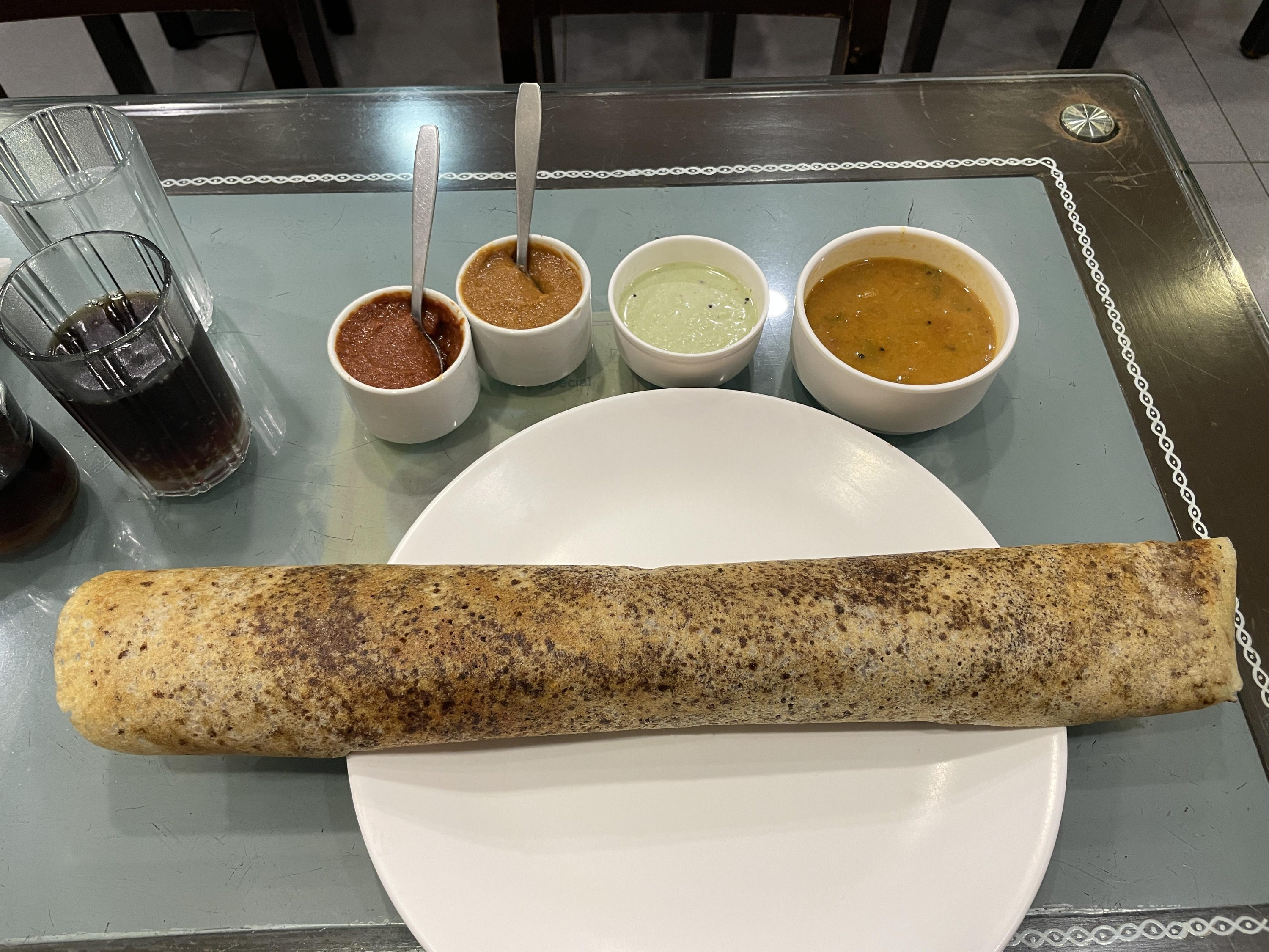 저녁시간이 되어 전통 남부 요리를 먹기 위해 dakshinayan 레스토랑으로 향했다. 종업원이 추천하는 스페셜 도사를 먹었다. 쌀과 렌틸콩으로 반죽한 부침개인 도사 안에는 으깬 감자가 들어 있었고 같이 나온 커리와 함께 먹으니 고로케와 흡사한 맛이었다. 오늘 하루 종일 여행하느라 허기졌던 몸과 마음을 가득 채워주는 만족감이 있었다.