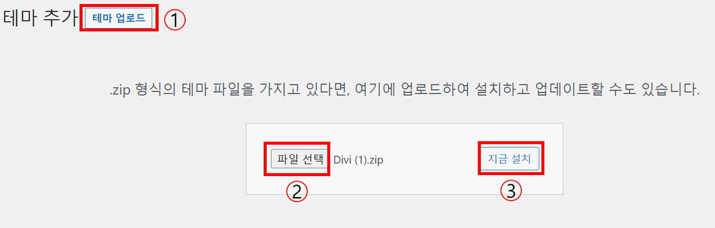 5) 테마업로드를 눌러 다운받은 Divi.zip 파일을 업로드 하고 지금 설치를 클릭합니다.